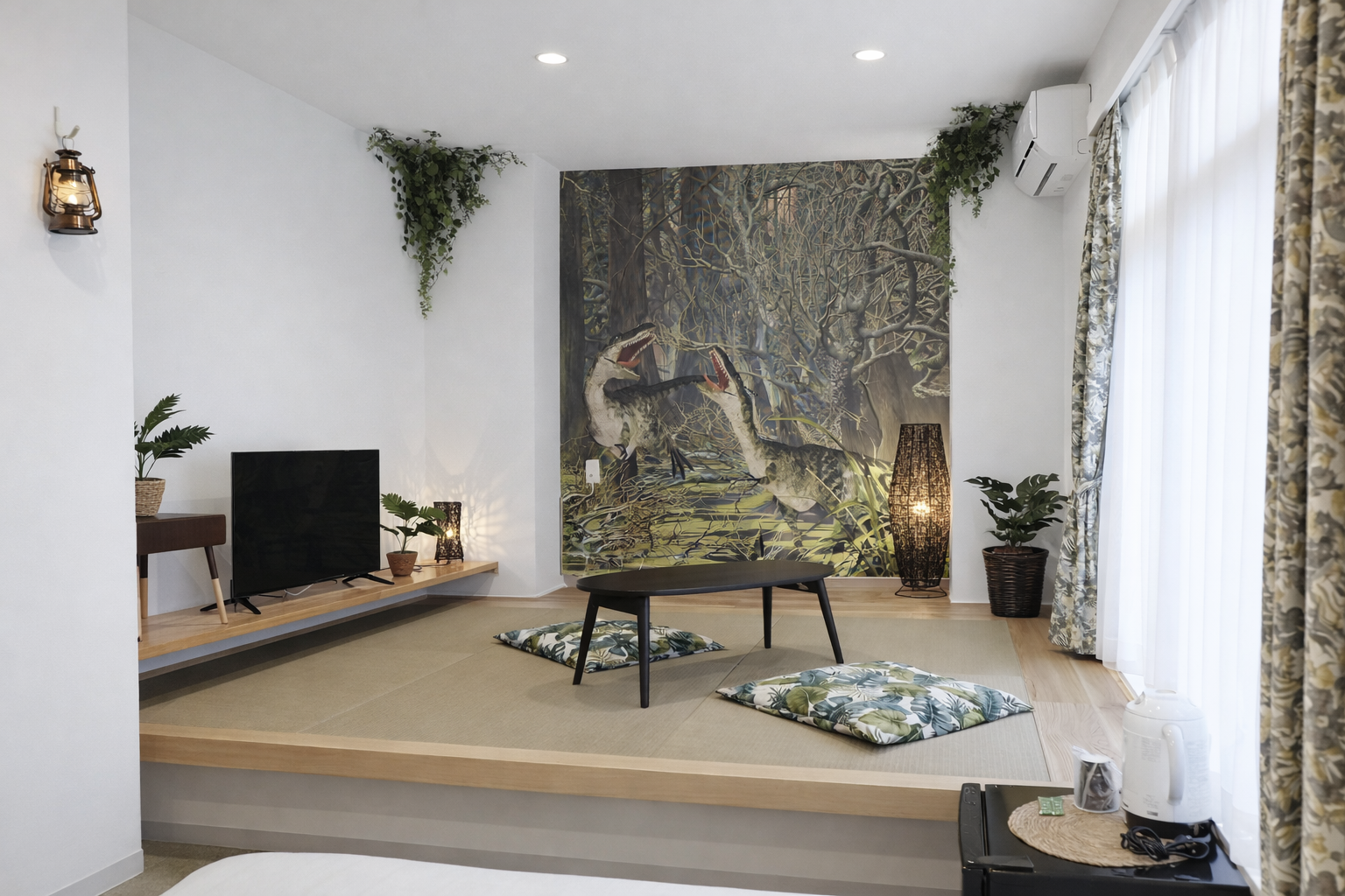 小上がりでくつろぎながら、恐竜の世界観に浸る、非日常のひとときをお過ごしください。